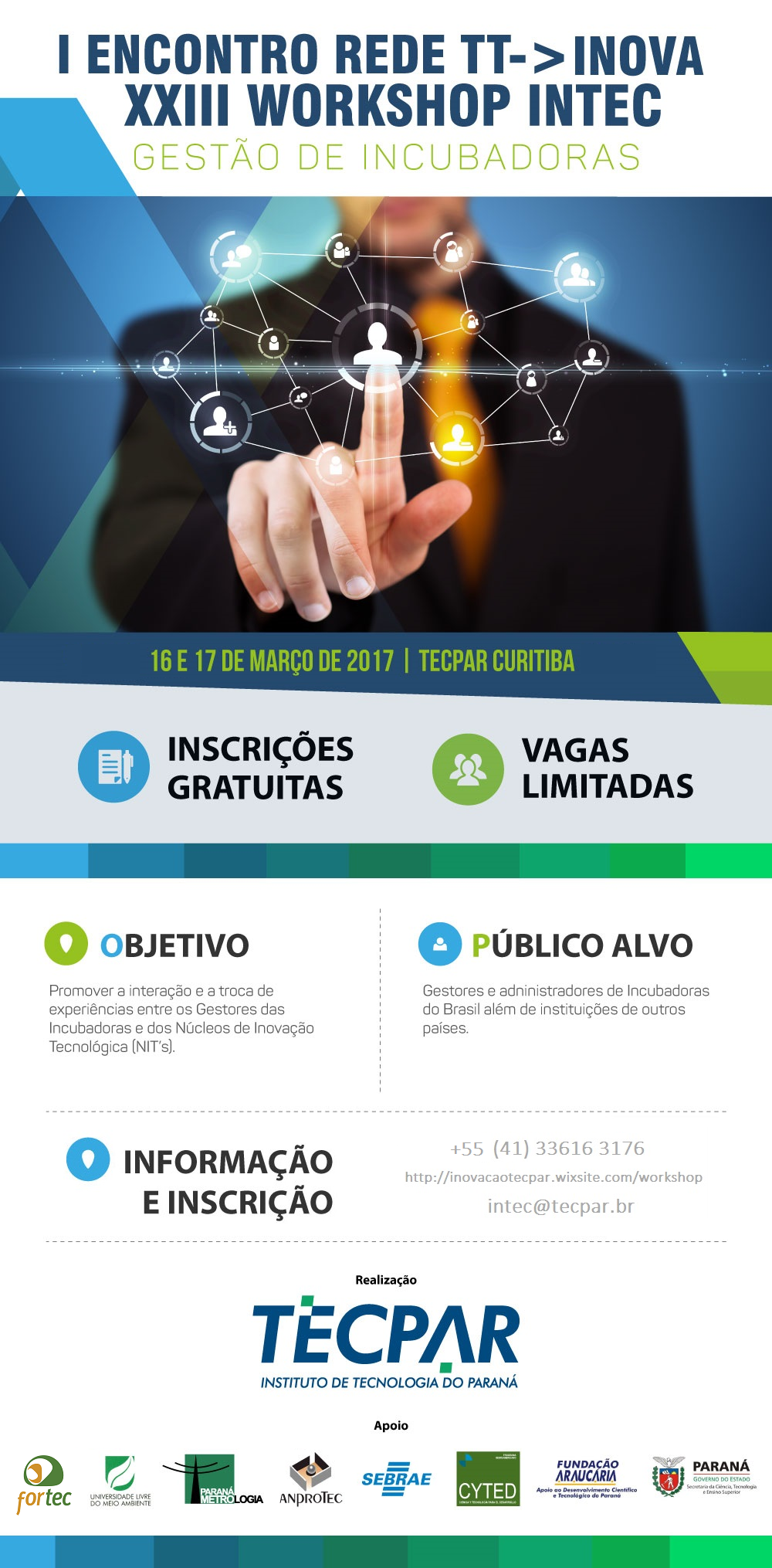 Associação Nacional de Entidades Promotoras de Empreendimentos Inovadores - Anprotec; Sebrae; Fundação Araucária; Governo do Paraná por meio da Secretaria de Ciência, Tecnologia e Ensino Superior; Vinculados à Rede TT->INOVA, os seguintes palestrantes se farão presentes: Sra. Cristina Montero, gerente da Incubadora Khem do Instituto Polo Tecnológico de Pando, no Uruguai; Sra. Angélica Mendes Salles, Gerente