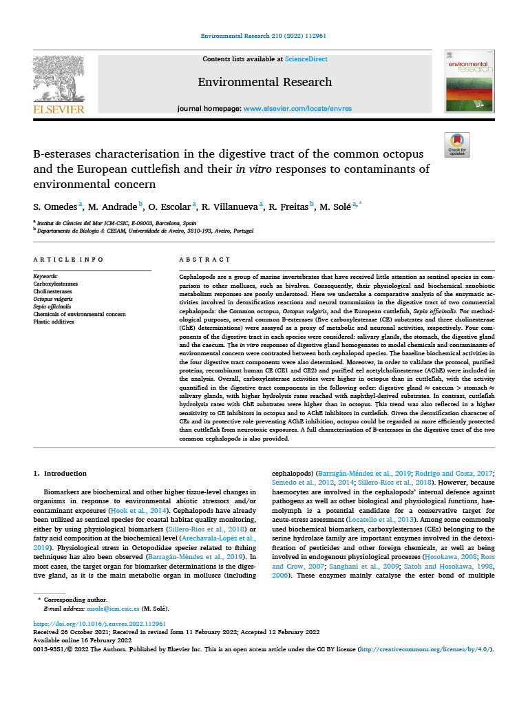 B-esterases characterisation in the digestive tract of the common octopus and the European cuttlefish and their in vitro responses to contaminants of environmental concern