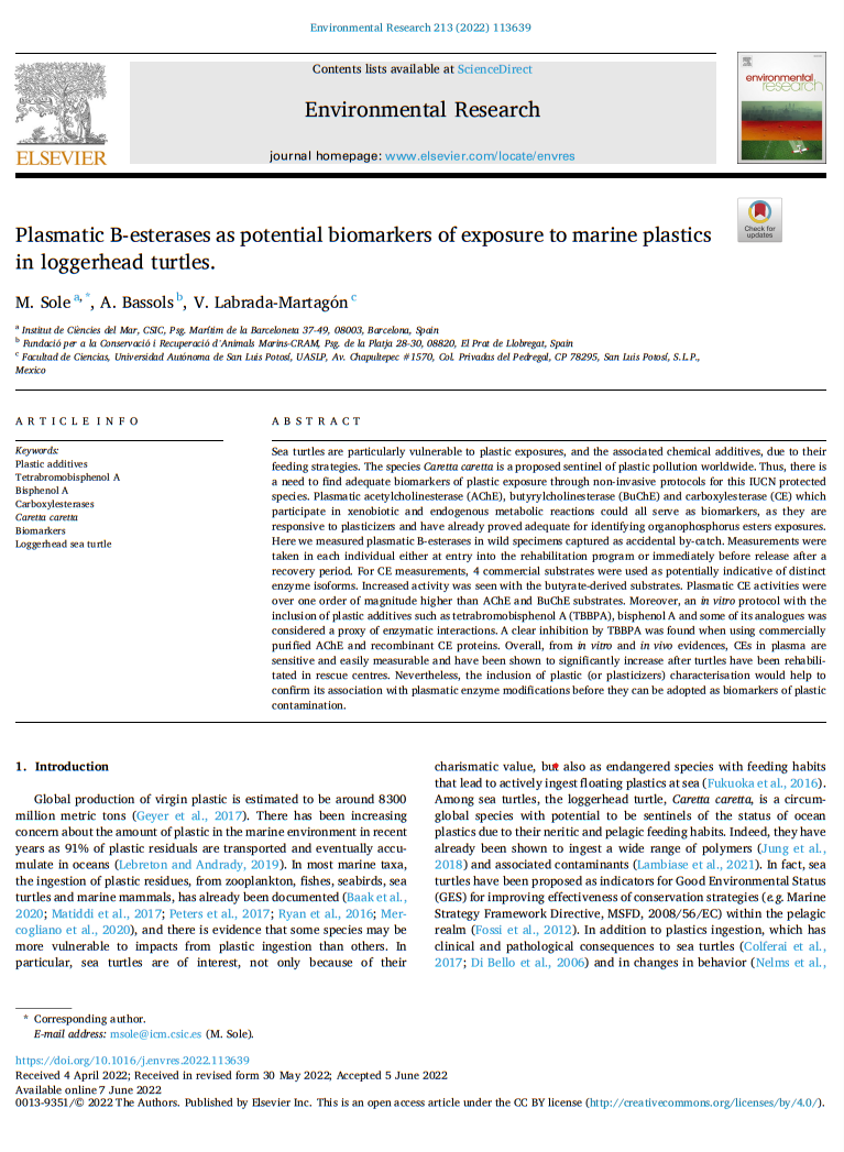 Plasmatic B-esterases as potential biomarkers of exposure to marine plastics in loggerhead turtles