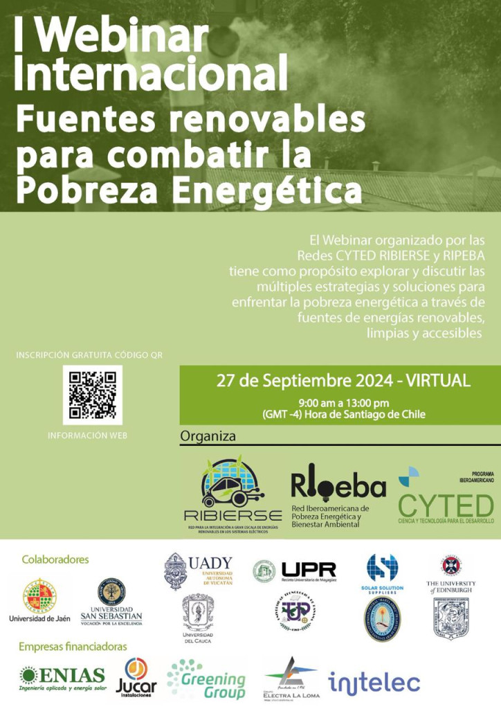 Con la participación de 20 expositores académicos e investigadores de distintos países y universidades de Iberoamérica, se llevó a cabo el 27 de septiembre de 2024 el Primer Webinar Internacional ?Fuentes Renovables para Combatir la Pobreza Energética?, organizado por la Red para la Integración a Gran Escala de Energías Renovables en los Sistemas Eléctricos (RIBIERSE ? CYTED) y la Red Iberoamericana de Pobreza Energética y Bienestar Ambiental (RIPEBA ? CYTED).