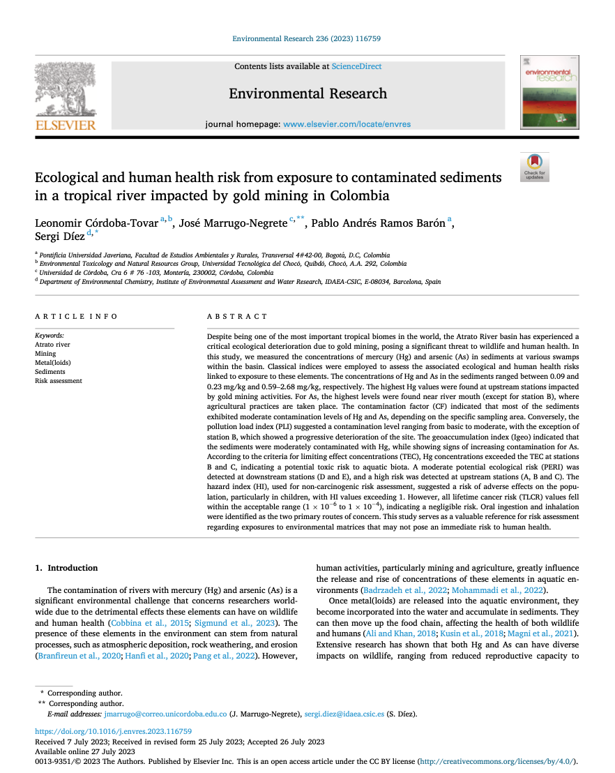Ecological and human health risk from exposure to contaminated sediments in a tropical river impacted by gold mining in Colombia