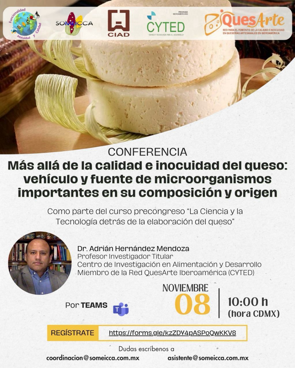 Evento gratuito online en el marco del curso precongreso "La Ciencia y la Tecnología detrás de la elaboración del queso del Congreso CUCCAL 17 Viernes 8 de Noviembre de 10:00 h a 11:00 hrs (CDMX)