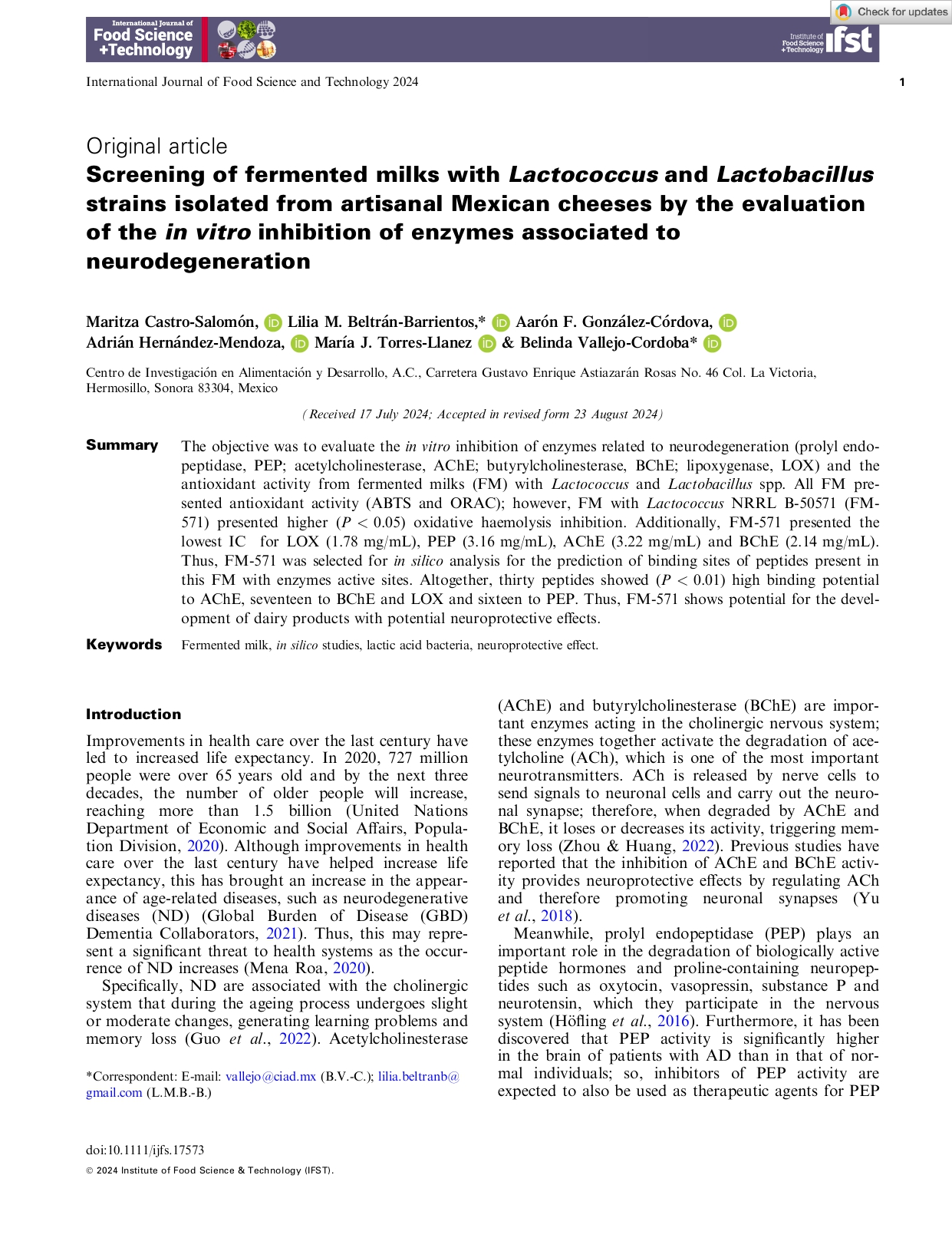 Screening of fermented milks with Lactococcus and Lactobacillus strains isolated from artisanal Mexican cheeses by the evaluation of the in vitro inhibition of enzymes associated to neurodegeneration