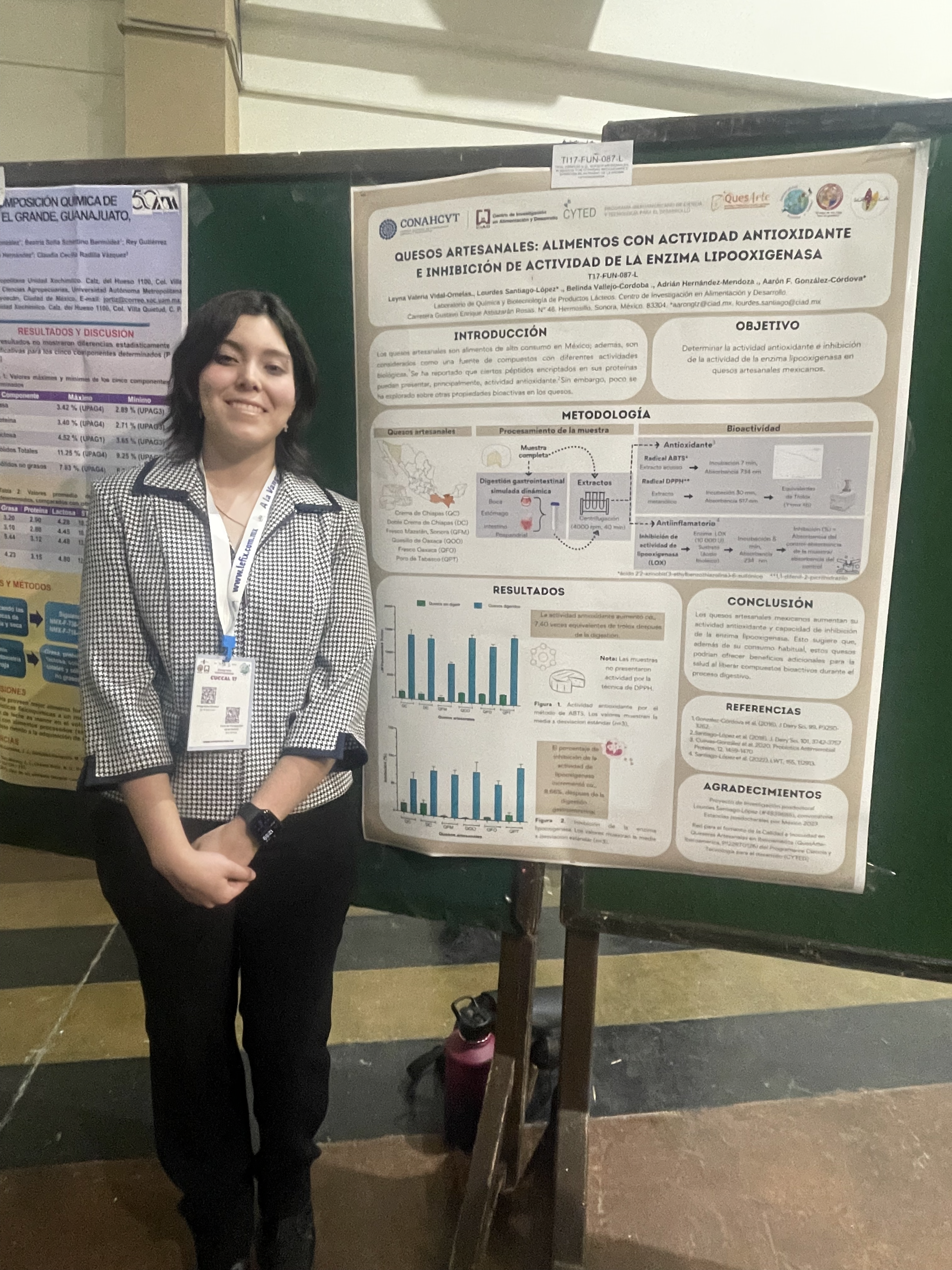 La estudiante de Licenciatura Leyna Valeria Vidal-Ornelas presentó el trabajo intitulado " Quesos artesanales: Alimentos con actividad antioxidante e Inhibición de la enzima Lipooxigenasa" en modalidad de póster. Actividades Congreso CUCCAL 17-SOMEICA 2024