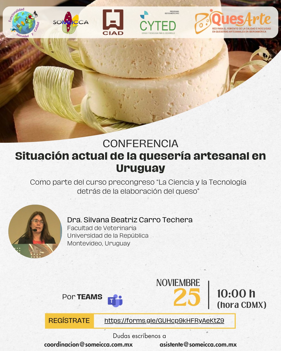 La Red QuesArte Iberoamérica del Programa Iberoamericano de Ciencia y Tecnología para el Desarrollo contó con la participación de la Dra. Silvana Carro con su conferencia "Situación actual de la quesería artesanal en Uruguay" en el precongreso CUCCAL 17-SO