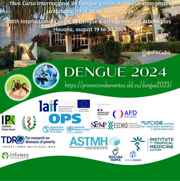 El Centro Colaborador de la OPS/OMS para el Estudio del Dengue y su Control, el Instituto de Medicina Tropical Pedro Kouri, la Sociedad Cubana de Microbiología y Parasitología y el Ministerio de Salud Pública de la República de Cuba, La Organización Panamericana de la Salud/Organización Mundial de la Salud, tienen el placer de anunciarle que del 19 al 30 de agosto de 2024 se efectuará la 18va. edición del Curso Internacional de Dengue y otros Arbovirus emergentes para la actualización y preparación frente a nuevas emergencias epidemiológicas de arbovirus. El curso se efectuará en saludo al 85 aniversario del Instituto de Medicina Tropical ¨Pedro Kouri¨, IPK
