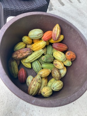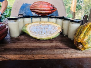 Se impartió una charla a mujeres y hombres, pequeños productores de café y cacao, sobre Economía Circular en sus sistemas alimentarios y se realizó una práctica de extracción de pectina de las cáscaras de cacao y maracuyá (Passiflora edulis), para darle un valor agregado a los residuos generados en sus fincas. Ellos pretenden comercializar esta pectina o utilizarla para la elaboración de alimentos que tengan potencial de mercado para generar renta y a su vez promover la Economía Circular.