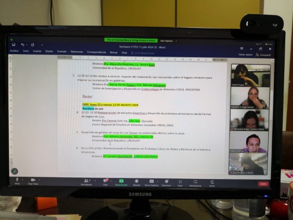 Se realizó una 4º Reunión Virtual por Zoom el 10 de Julio de 2024 para coordinar las presentaciones de un SEMINARIO (WEBINAR) INTERNACIONAL DE VALORIZACIÓN y DESARROLLO DE PROTOTIPOS DESDE RESIDUOS DE CERVEZA, CACAO y VINO que tendrá lugar en forma virtual los días 12 y 13 de Agosto de 2024.