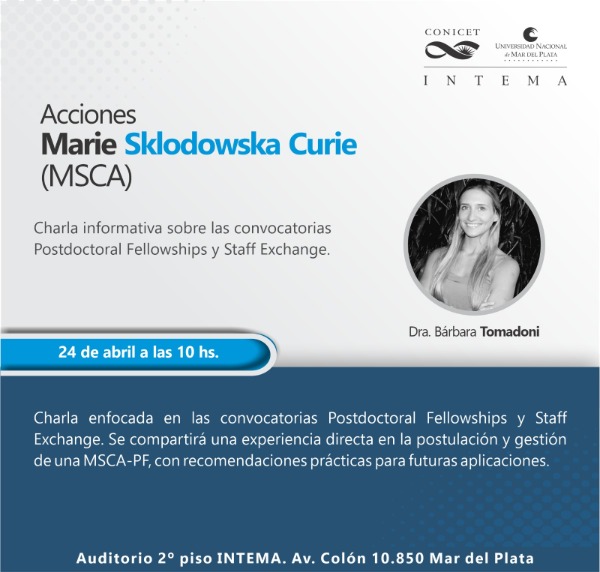 Charla informativa sobre Acciones Marie Sklodowska Curie, presentada en el INTEMA Mar del Plata, Argentina