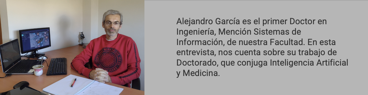 Alejandro García es el primer Doctor en Ingeniería, Mención Sistemas de Información, de nuestra Facultad. En esta entrevista, nos cuenta sobre su trabajo de Doctorado, que conjuga Inteligencia Artificial y Medicina. Además, como Director del Grupo de Investigación en Inteligencia Artificial (GIA), nos comenta las líneas de estudio que están desarrollando y nos explica el concepto de Inteligencia Artificial, su funcionamiento en "redes neuronales" y sus aplicaciones actuales en la sociedad.
