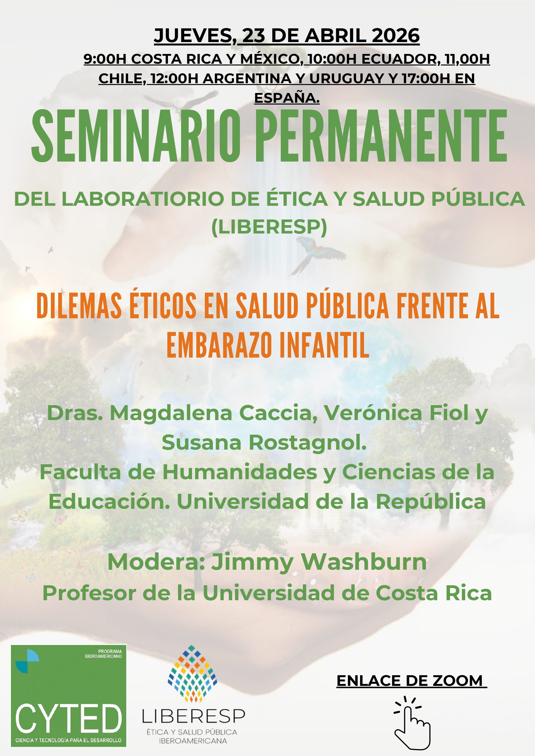 Invitamos a todas las personas a la nueva sesión del Seminario Permanente LIBERESP. En esta ocasión Magdalena Caccia Verónica Fiol y Susana Rostagnol de la Universidad de la República (Uruguay), nos presentarán la charla titulada Dilemas éticos en salud pública frente al embarazo infantil.