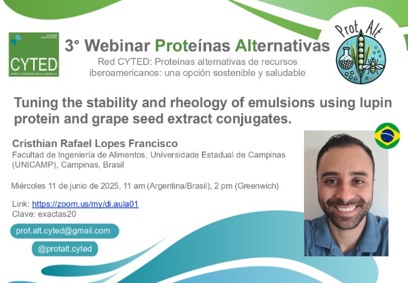 El título de dicho webinar es: "Tuning the stability and rheology of emulsions using lupin protein and grape seed extract conjugates", y será disertado por Cristhian Rafael Lopes Francisco de la Facultad de Ingeniería de Alimentos, Universidade Estadual de Campinas (UNICAMP), Campinas, Brasil.