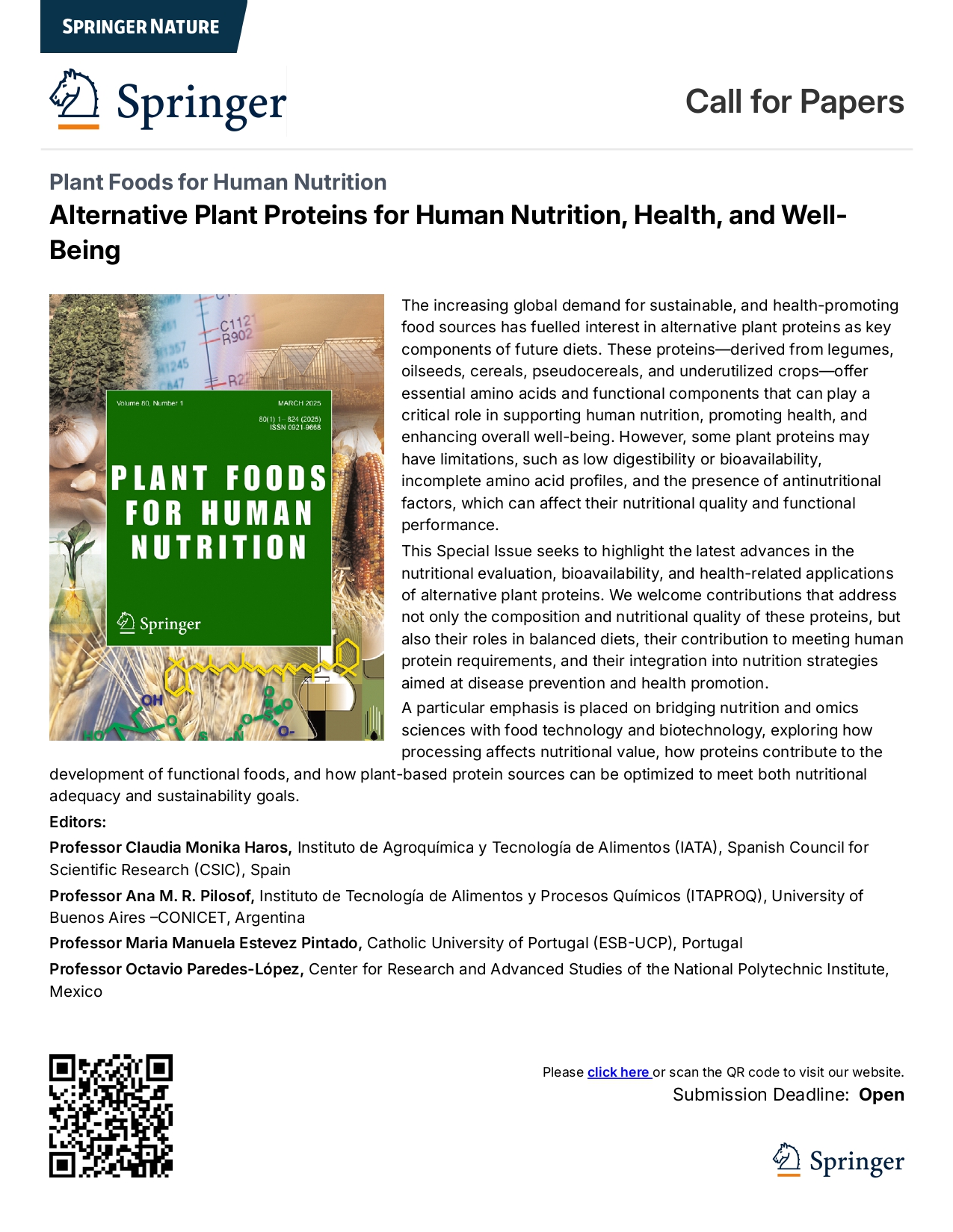 Invitamos a enviar artículos a esta edición especial de la revista Plant Foods for Human Nutrition, de editorial Springer, la cual tiene como editores a tres miembros de nuestra red.