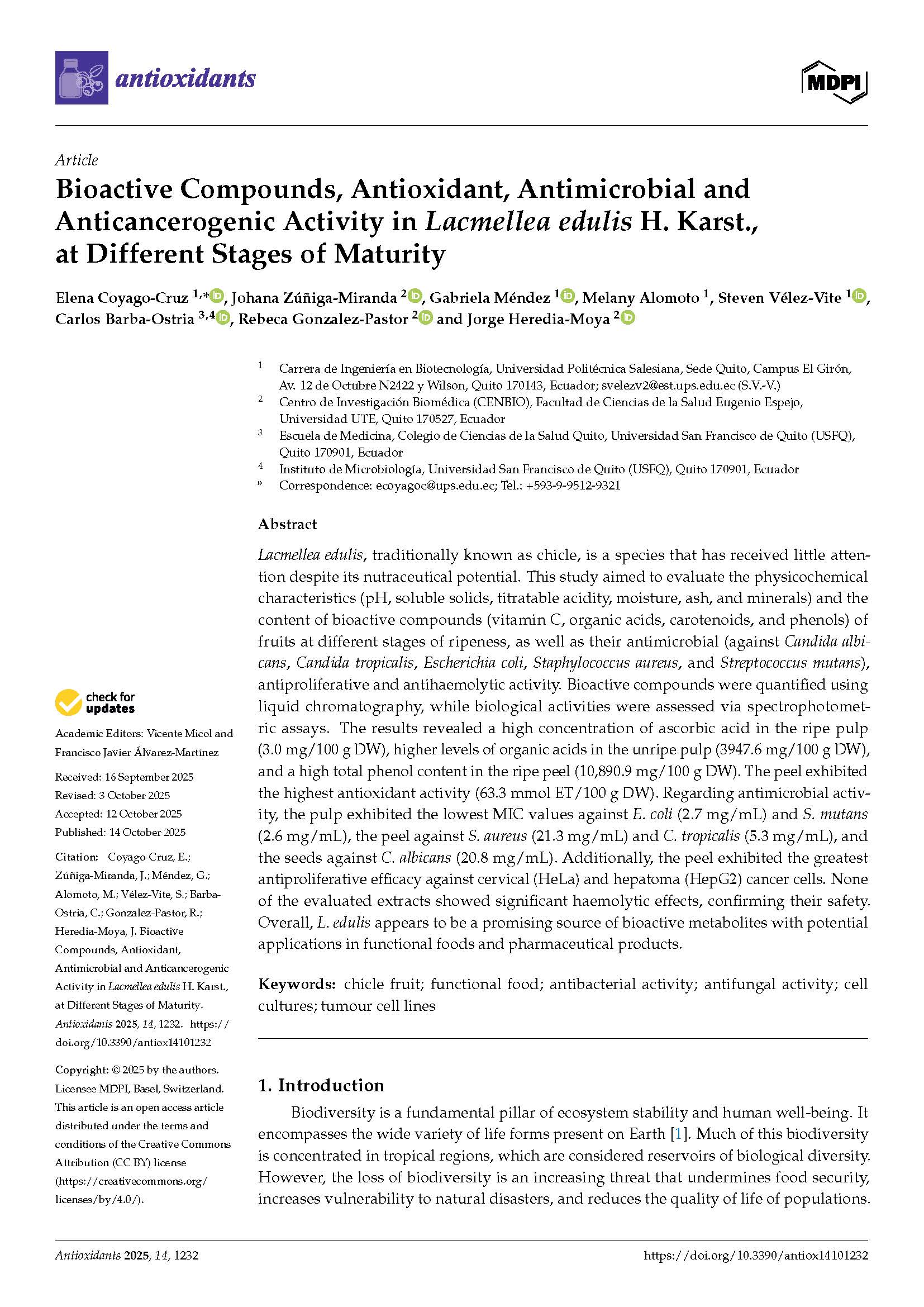 Bioactive Compounds, Antioxidant, Antimicrobial and Anticancerogenic Activity in Lacmellea edulis H. Karst., at Different Stages of Maturity