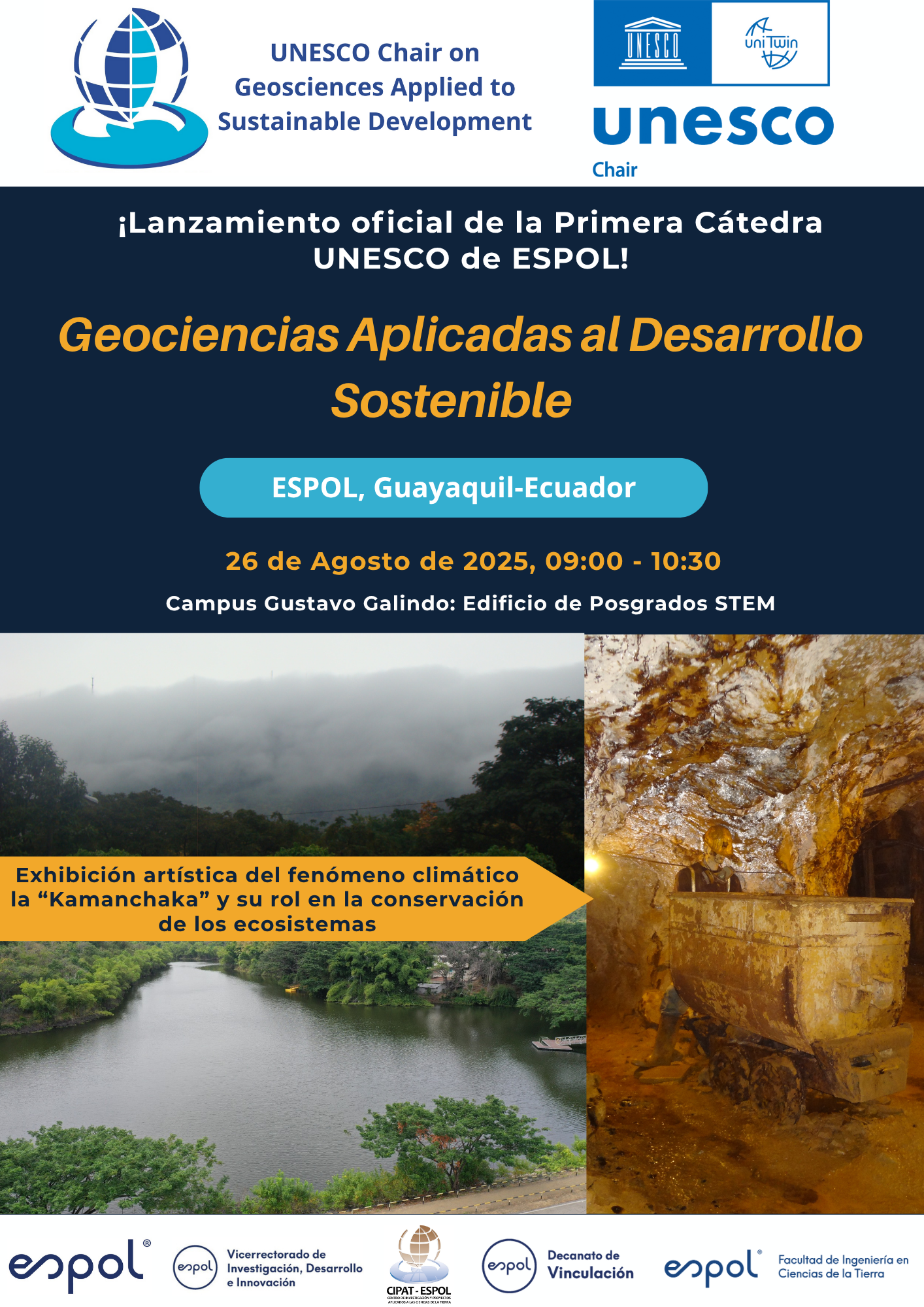 La inauguración de la primera Cátedra UNESCO de la ESPOL marca un hito trascendental en su trayectoria académica y proyección internacional. El acuerdo, suscrito el 30 de mayo de 2025 en coordinación con la Organización de las Naciones Unidas para la Educación, la Ciencia y la Cultura (UNESCO), con vigencia de cuatro años, reconoce el compromiso de la universidad con la excelencia en la investigación, la docencia y la vinculación con la sociedad. ESPOL se integra así a una red formada por más de 1000 cátedras y 45 redes en 125 países. La nueva Cátedra UNESCO en Geociencias Aplicadas al Desarrollo Sostenible de ESPOL, liderada por el Centro de Investigación y Proyectos Aplicados a las Ciencias de la Tierra (CIPAT), presenta dos líneas de investigación: i) siembra y cosecha de agua, y ii) geoturismo, geoconservación y geoeducación. El evento tendrá lugar en el edificio de Posgrados STEM, ubicado en el Campus Gustavo Galindo de la ESPOL, el día martes 26 de agosto de 2025, en el horario de 9h00 a 10h30. Este evento de inauguración marca el inicio de una plataforma internacional para el diálogo, la investigación y la formación, alineada con los Objetivos de Desarrollo Sostenible (ODS) y los principios de la UNESCO. Durante el evento se contará con la participación de autoridades académicas, representantes de la UNESCO, investigadores nacionales e internacionales, y actores clave del sector público, privado y comunitario