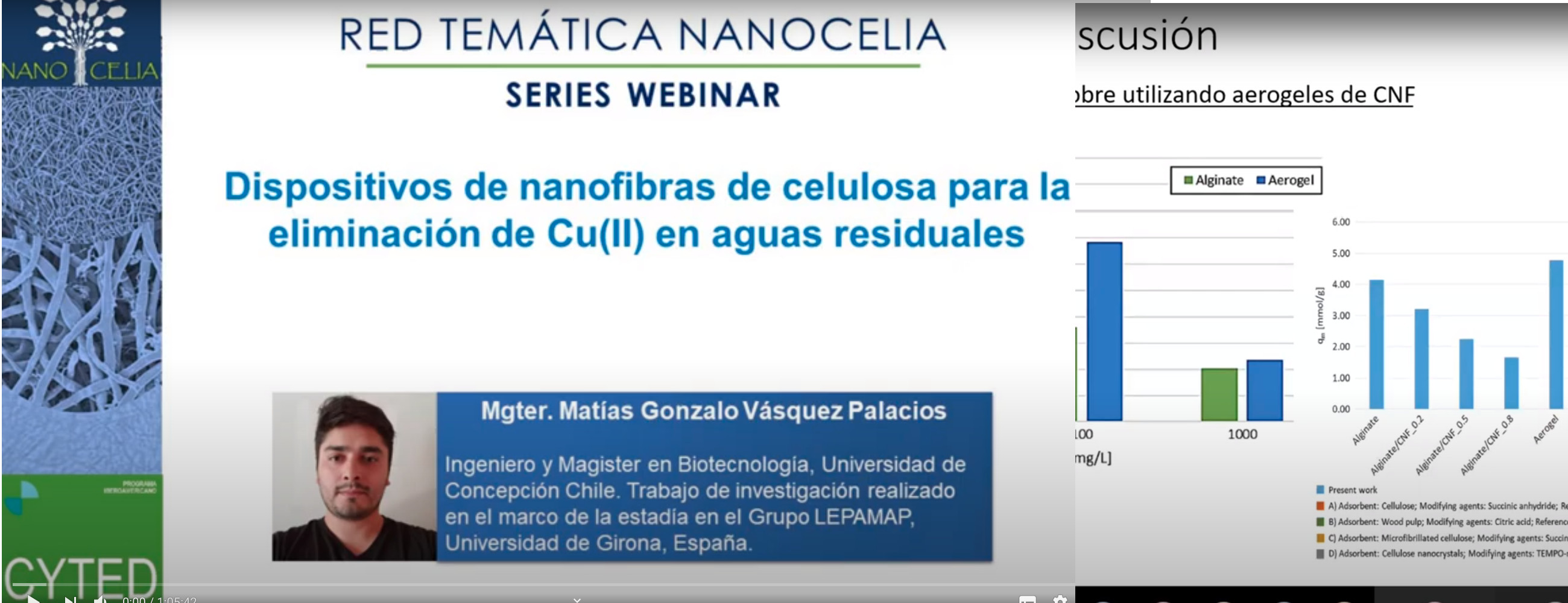 Dispositivos de nanofibras de celulosa para la eliminación de Cu(II) en aguas residuales. Este seminario fue presentado por el Mgter. Matías Gonzalo Vásquez Palacios, Ingeniero y Magister en Biotecnología de la Universidad de Concepción (Chile). Trata sobre el trabajo de investigación realizado en el marco de su estadía en el Grupo LEPAMAP, Universidad de Girona, España. El seminario fue moderado por el Dr. Marc Delgado-Aguilar (LEPAMAP, Universidad de Girona, España).