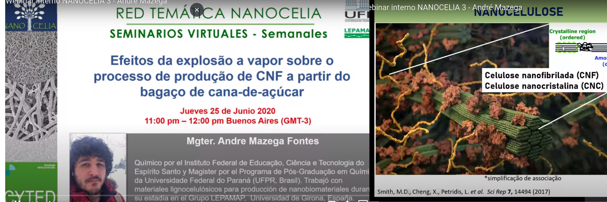 "Efeitos da explosão a vapor sobre o processo de produção de CNF a partir do bagaço de cana-de-açúcar". Seminario presentado por el Mgter. Andre Mazega Fontes, Químico por el Instituto Federal de Educação, Ciência e Tecnologia do Espírito Santo y Magíster por el Programa de Pós-Graduação em Química da Universidade Federal do Paraná (UFPR, Brasil). Trabajó con materiales lignocelulósicos para producción de nanobiomateriales durante su estadía en el Grupo LEPAMAP, Universidad de Girona, España. El Dr. Marc Delgado-Aguilar (LEPAMAP, Universidad de Girona, España) presidió la sesión. .