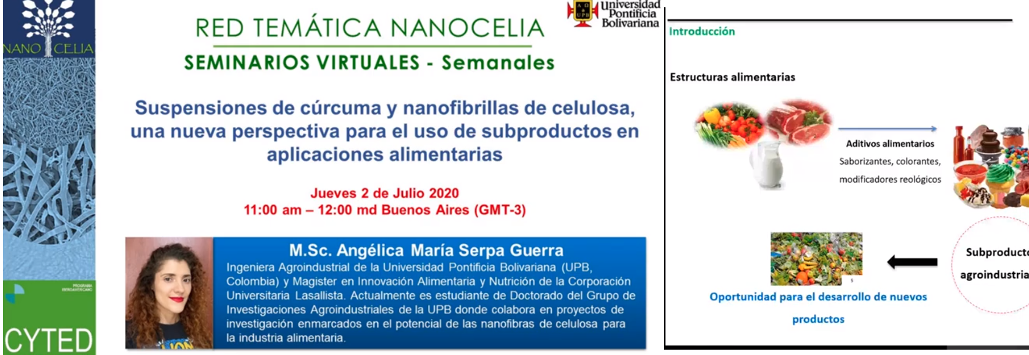 "Suspensiones de cúrcuma y nanofibrillas de celulosa, una nueva perspectiva para el uso de subproductos en aplicaciones alimentaria". Seminario presentado por la Mgter.Angélica María Serpa Guerra, Ingeniera Agroindustrial de la Universidad Pontificia Bolivariana (UPB, Medellín - Colombia) y Magíster en Innovación Alimentaria y Nutrición de la Corporación Universitaria Lasallista. Actualmente es estudiante de Doctorado del Grupo de Investigaciones Agroindustriales de la UPB donde colabora en proyectos de investigación enmarcados en el potencial de las nanofibras de celulosa para la industria alimentaria. Esta sesión fue presidida por el Dr. Quim Tarrés (LEPAMAP, Universidad de Girona, España).