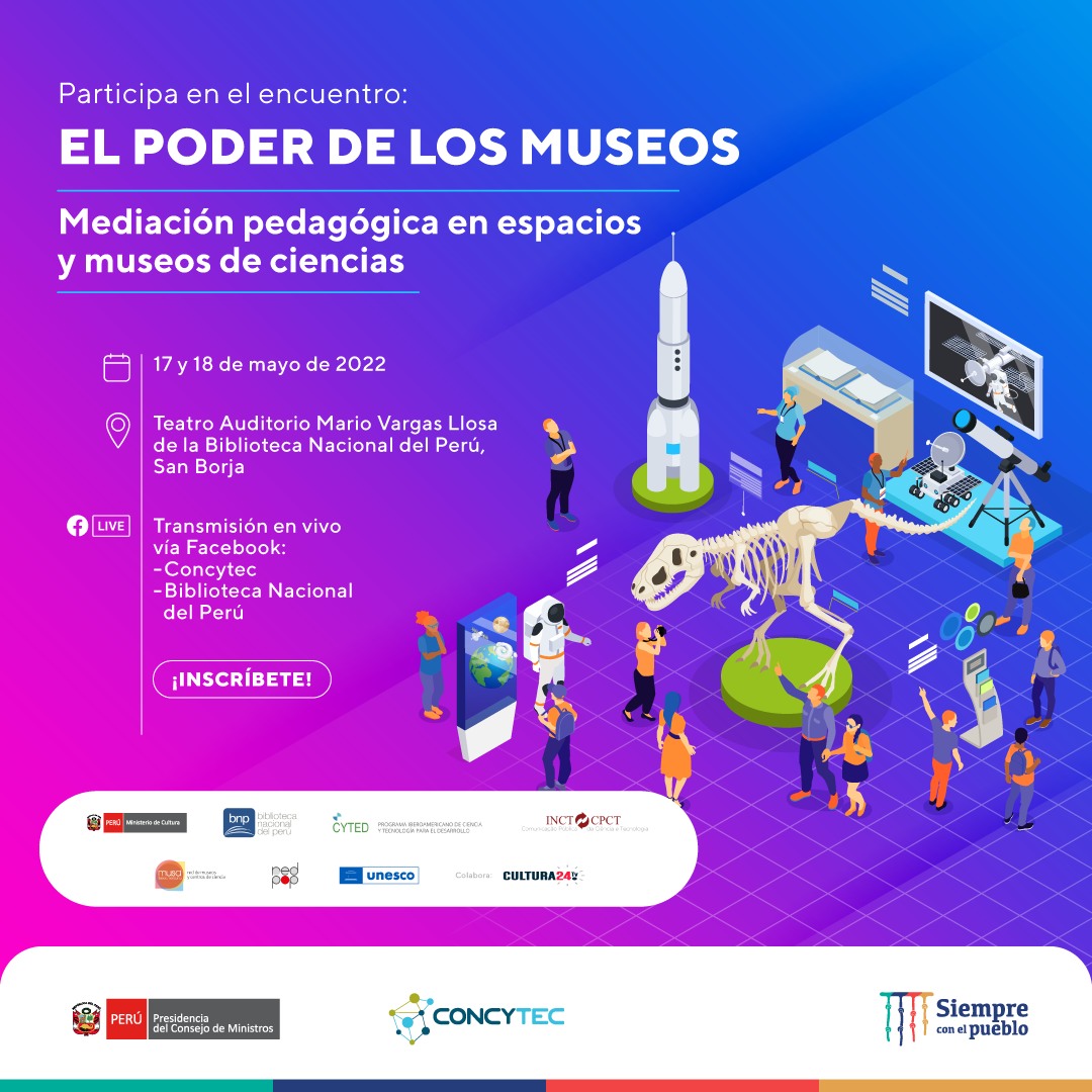 Este 17 y 18 de mayo, MUSA: Red de museos y centros de ciencia/Cyted y el el Consejo Nacional de Ciencia, Tecnología e Innovación Tecnológica del Perú (Concytec) –en colaboración con el Ministerio de Cultura, la Biblioteca Nacional del Perú, UNESCO Perú y otras instituciones promotoras de la ciencia en los países iberoamericanos– ofrecerán el evento internacional El poder de los museos: mediación pedagógica en espacios y museos de ciencias, un espacio para el diálogo sobre la importancia de la mediación pedagógica, accesibilidad e inclusión en los museos y centros de divulgación de la ciencia, con la participación de destacados expertos iberoamericanos.