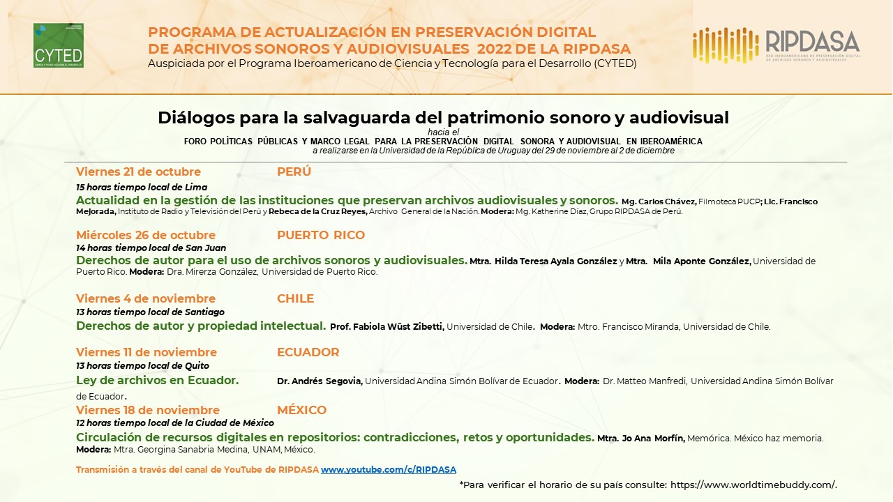 PROGRAMA DE ACTUALIZACIÓN EN PRESERVACIÓN DIGITAL DE ARCHIVOS SONOROS Y AUDIOVISUALES 2022 DE LA RIPDASA Auspiciada por el Programa Iberoamericano de Ciencia y Tecnología para el Desarrollo (CYTED)