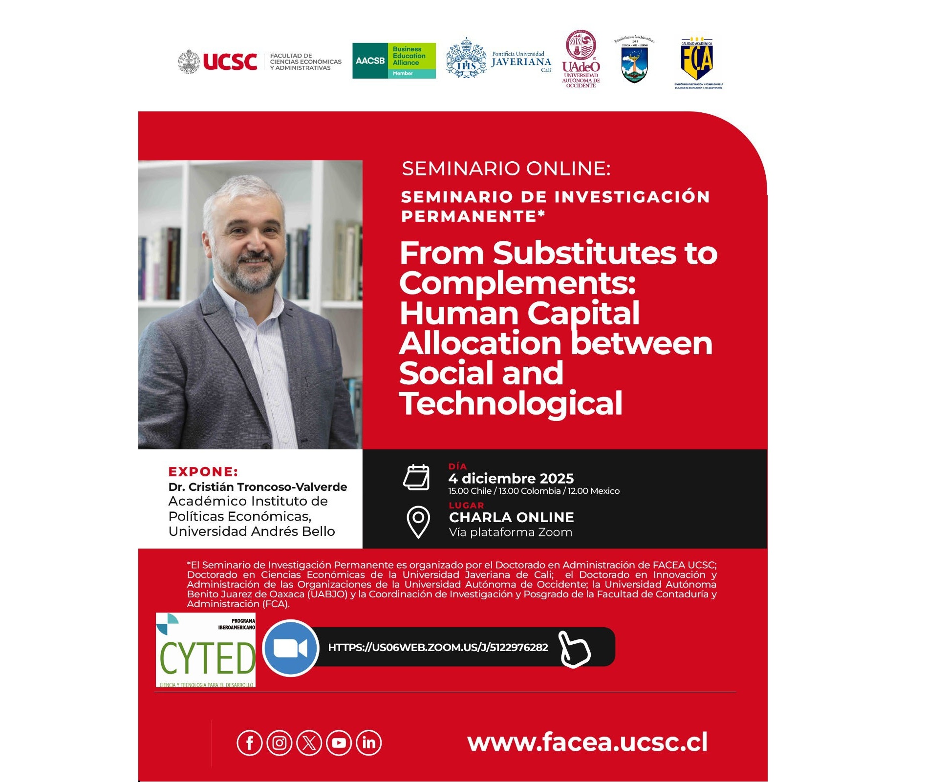 El 4 de diciembre de 2025 se impartió el Seminario Internacional SIEMCI titulado "From Substitutes to Complements: Human Capital Allocation between Social and Technological" Impartido por el Dr. Crist