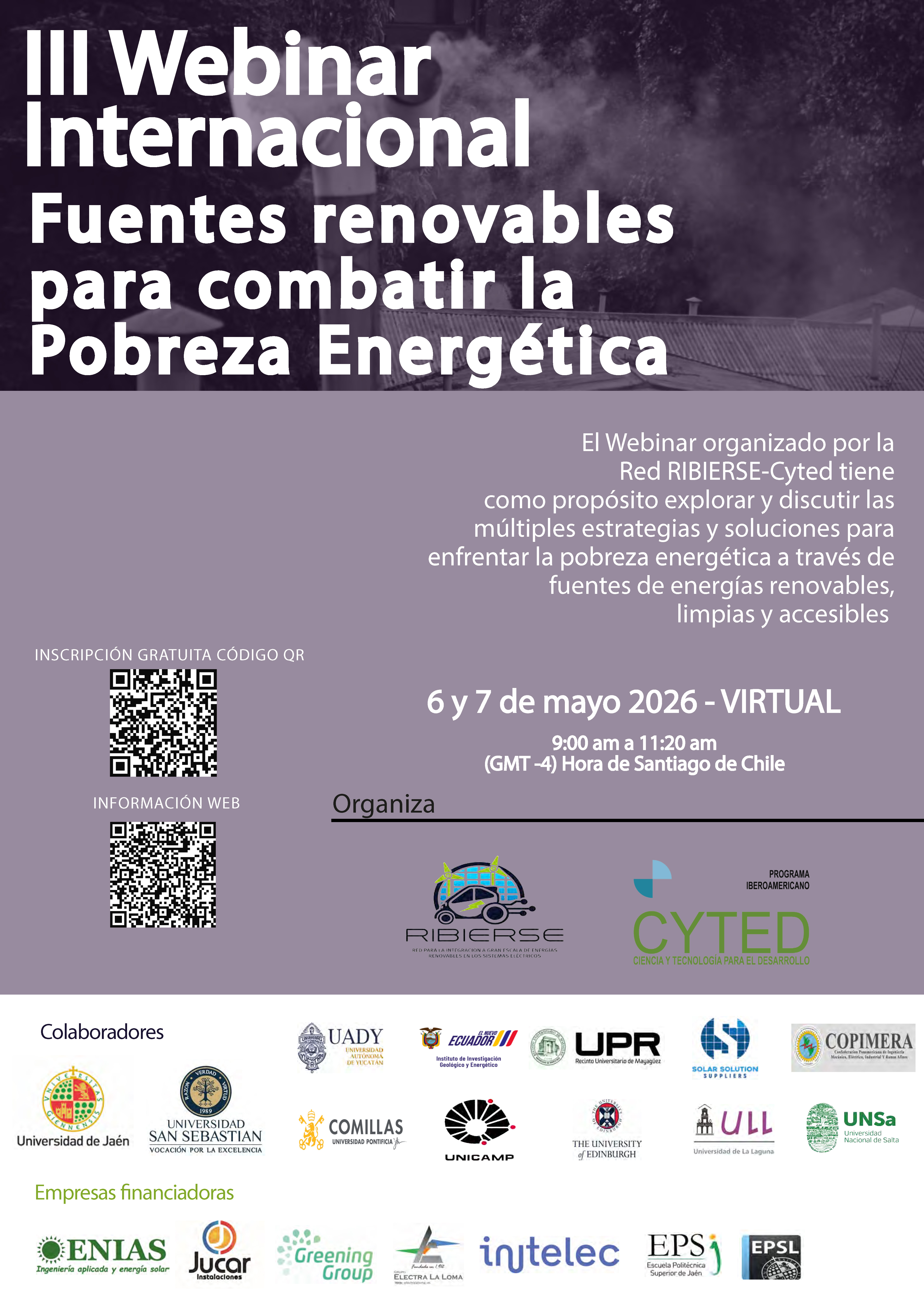 La red RIBIERSE-CYTED organiza el I Workshop Internacional sobre Energías Renovables: Avances, Desafíos y Perspectivas Globales que se va a celebrar el