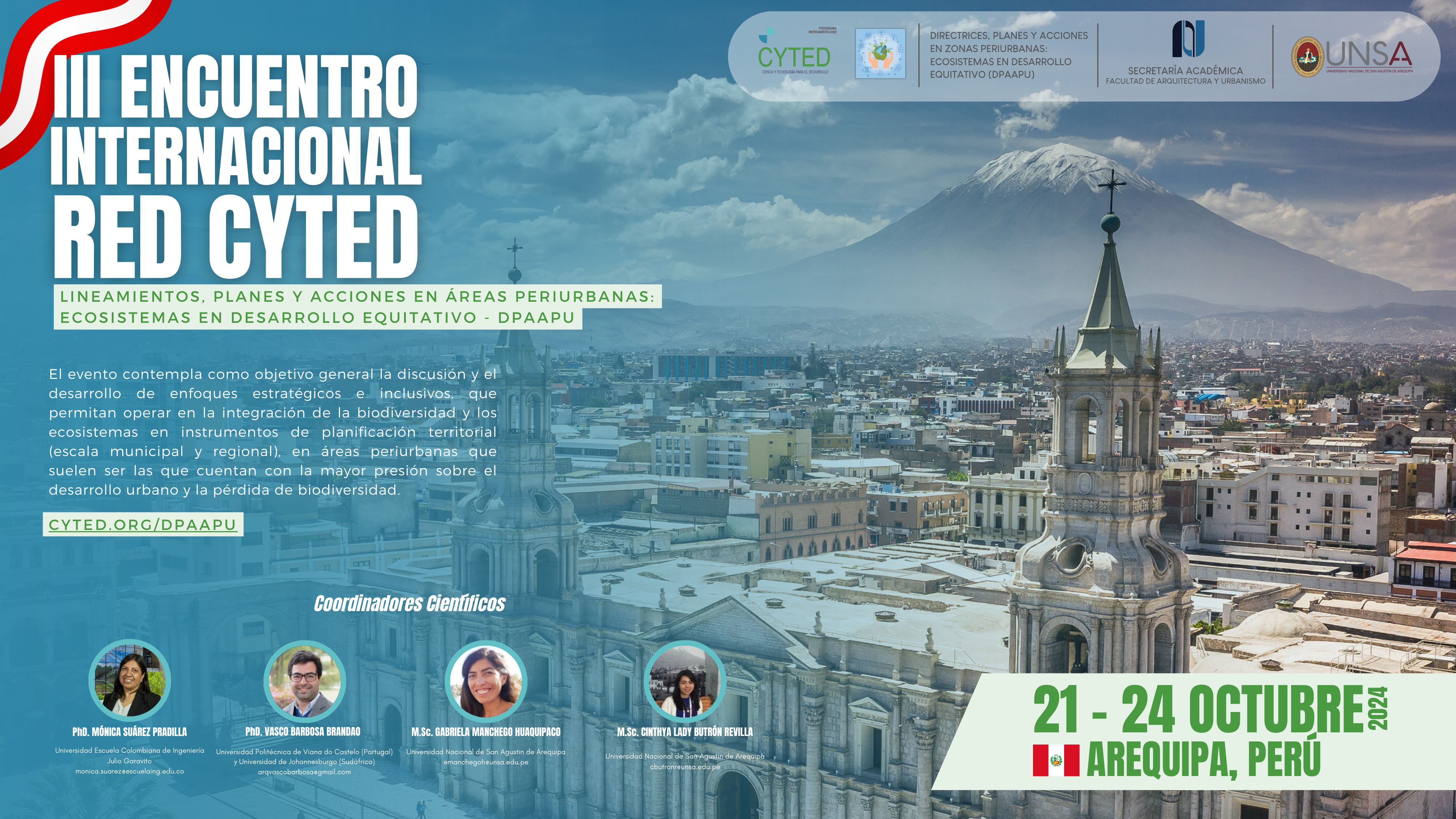 Este I Encuentro Internacional Red Cyted "LINEAMIENTOS, PLANES, ACCIONES EN ÁREAS PERIURBANAS: ECOSISTEMAS EN DESARROLLO EQUITATIVO (DPAAPU)", se realizará del 2 al 5 de Noviembre en Bogotá, Colombia,