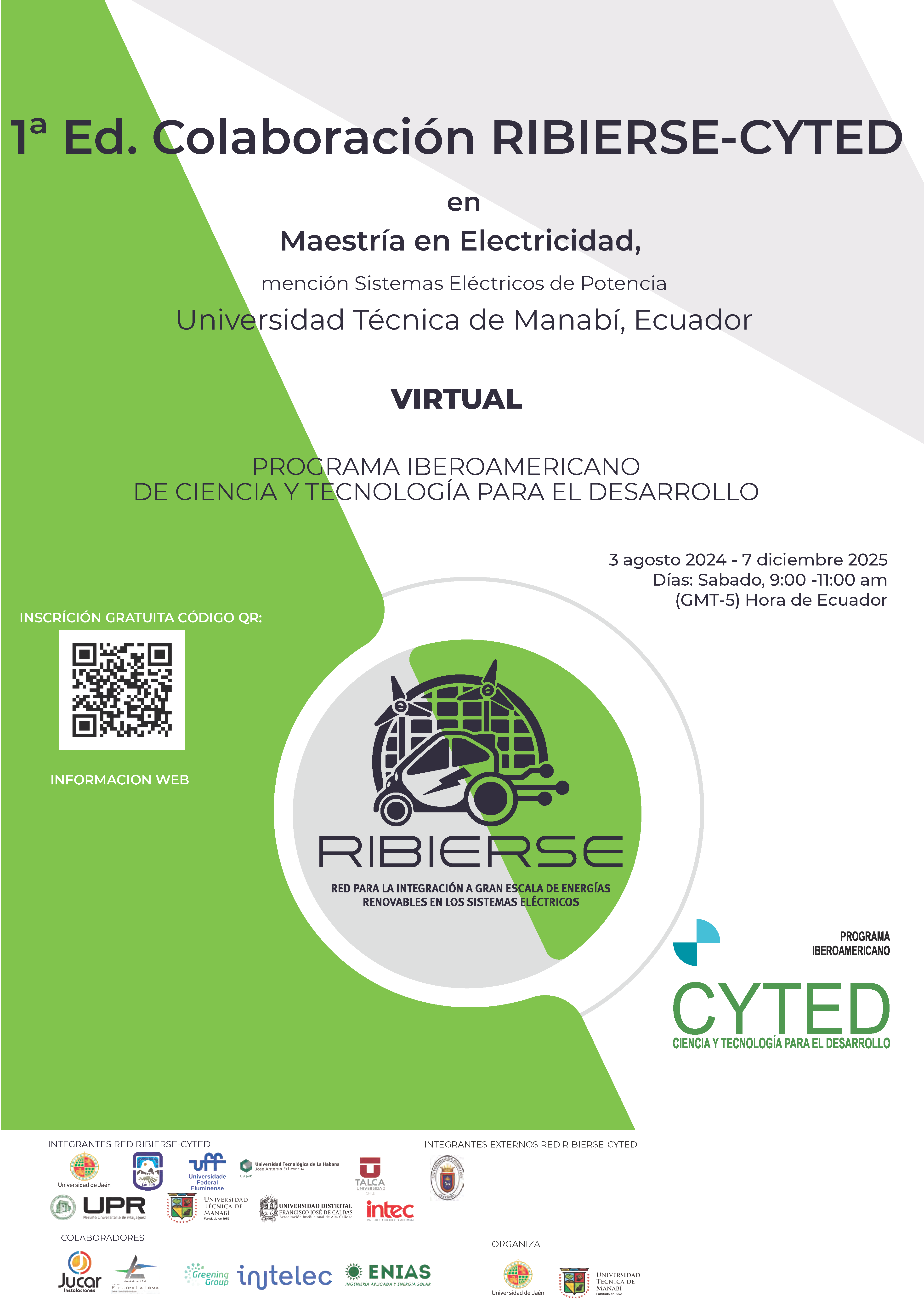 La red RIBIERSE-CYTED organiza esta 1ª Edición de Colaboración en Maestría en Electricidad, mención Sistemas Eléctricos de Potencia, Universidad Técnica de Manabí, Ecuador, que se va a celebrar en dis