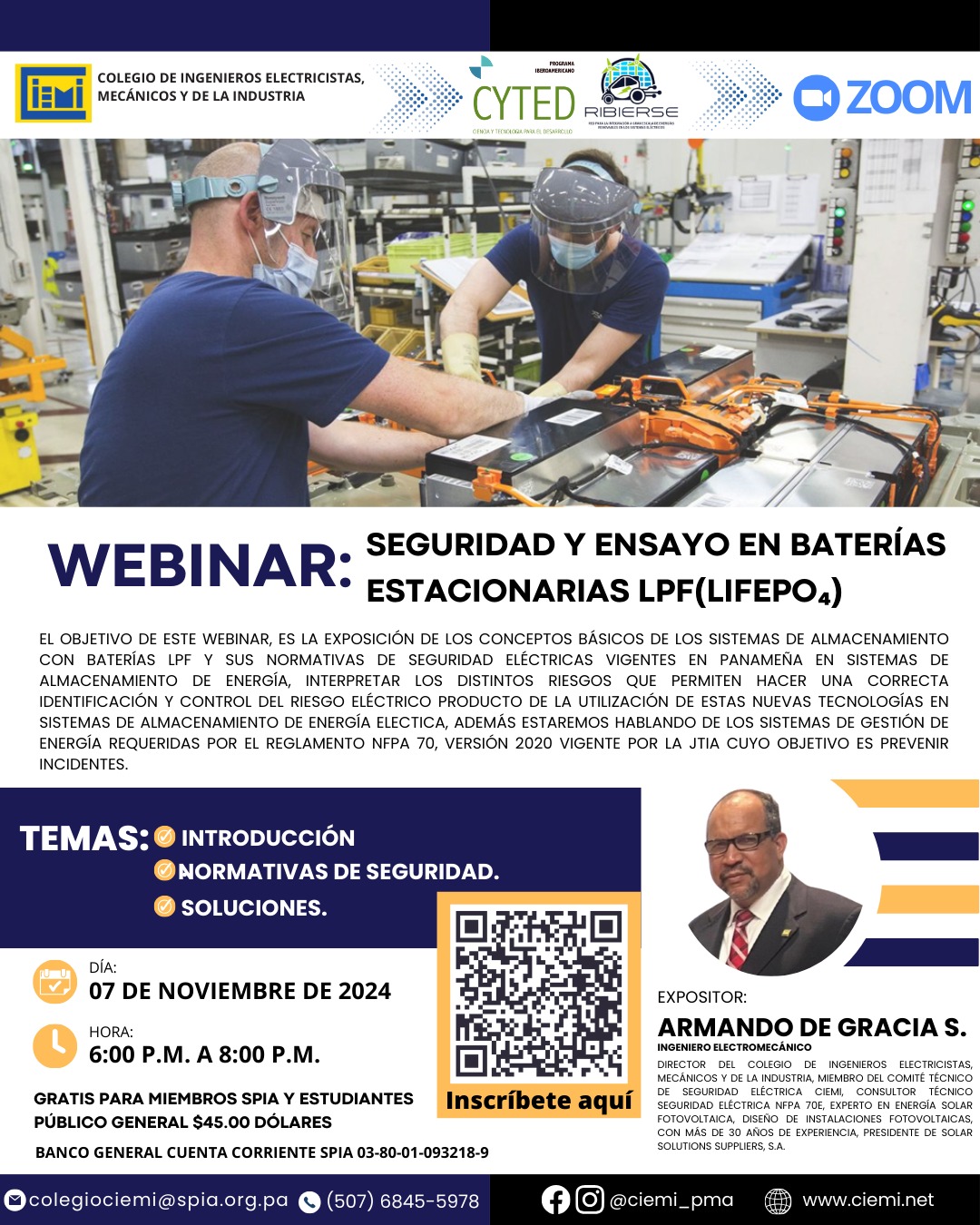 El objetivo de este webinar, es la exposición de los conceptos básicos de los sistemas de almacenamiento con baterías LPF y sus normativas de seguridad eléctricas vigentes en panameña en sistemas de a