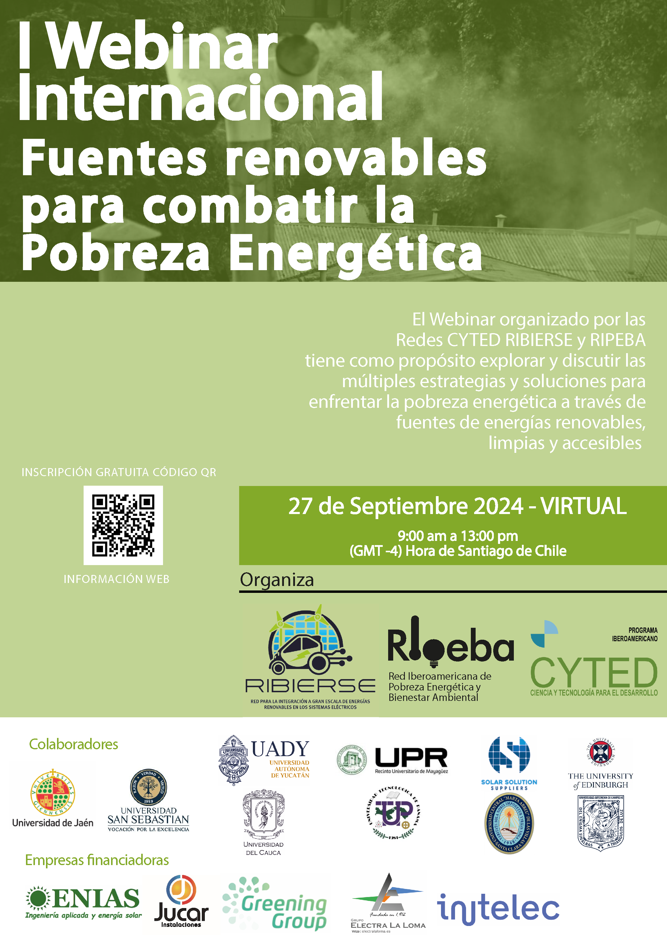 Las redes RIBIERSE-CYTED y RIBEBA-CYTED organizan este I Webinar Internacional sobre Fuentes renovables para combatir la Pobreza Energética, que se va a celebrar el próximo 27 de septiembre 2024 en ho