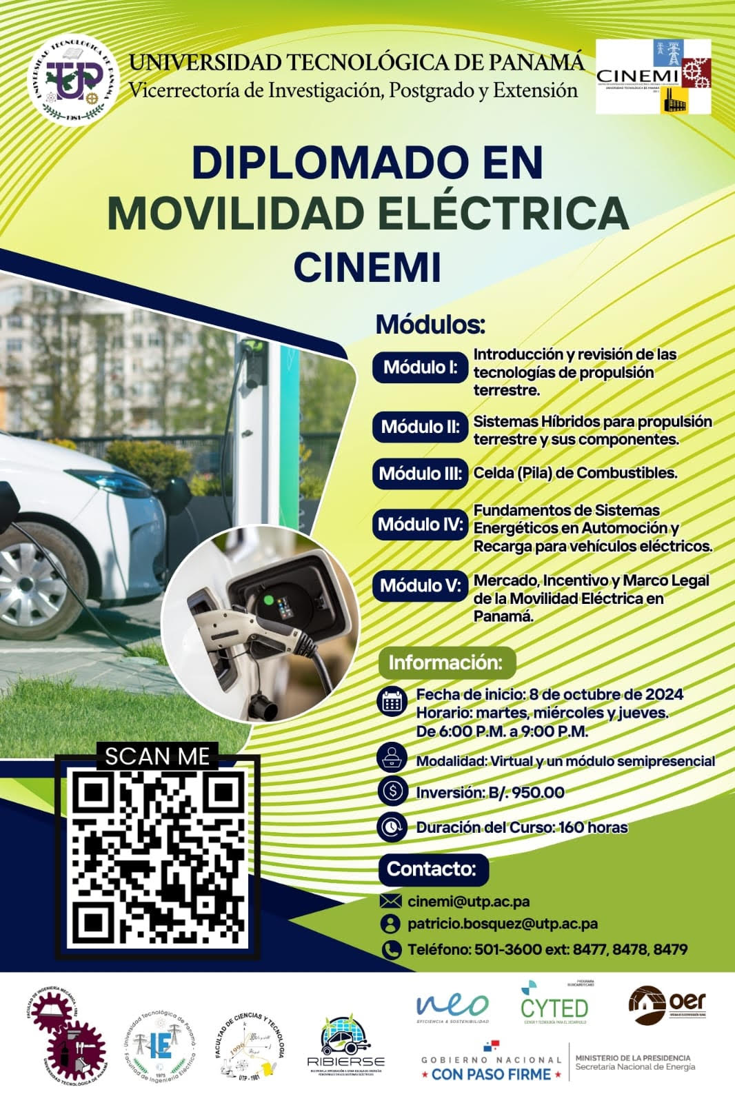 La Universidad Tecnológica de Panamá, CINEMI organiza el Diplomado en Movilidad eléctrica con carácter semipresencial a partir del próximo 8 de octubre de 2024 ( martes, miércoles y jueves de 6.00 pm