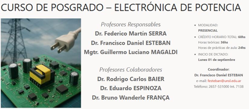 El curso de posgrado ?Electrónica de potencia? surge de la necesidad de formar y capacitar ingenieros (estudiantes de posgrado y docentes) en el análisis y diseño de convertidores electrónicos de pote