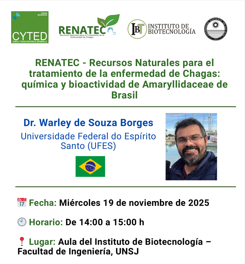 En el marco de la tematica que se desarrolla en la RED RENATEC Area Salud CYTED, la movilidad desde el grupo de Colombia (que coordinan Dr Edison Osorio y Omar Triana), la presentacion estuvo relacionada a los avances recientes sobre el estudio y potencial bioactivo de los alcaloides de amarilidaceas para encontrar moleculas que tengan potencial bioactivo frente al parasito implicado en la Enfermedad de Chagas. Comento sobre resultados, metodos aplicados y el aislamiento y elucidacion de las moleculas identificadas.
