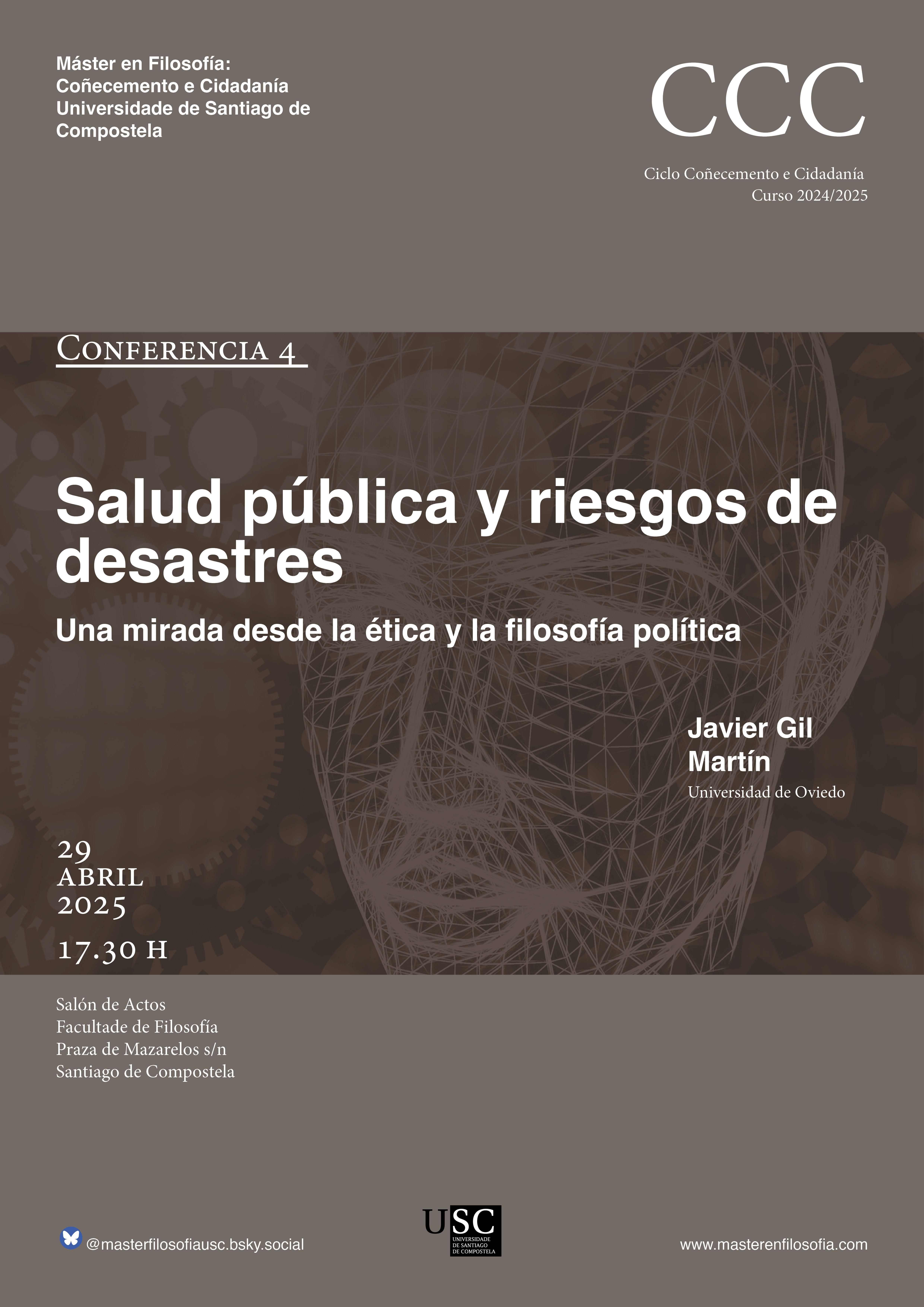 Javier Gil (nodo España) impartirá la conferencia titulada "Salud pública y riesgos de desastres: una mirada desde la ética y la filosofía política" en el Máster Universitario en Filosofía: Conocimien