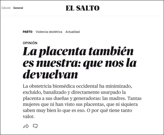 Nuestra compañera Ester Massó Guijarro, miembro de LIBERESP (nodo España) y FiloLab, publicó el 5 de noviembre, en El Salto Diario, un artículo titulado «La placenta también es nuestra: que nos la dev