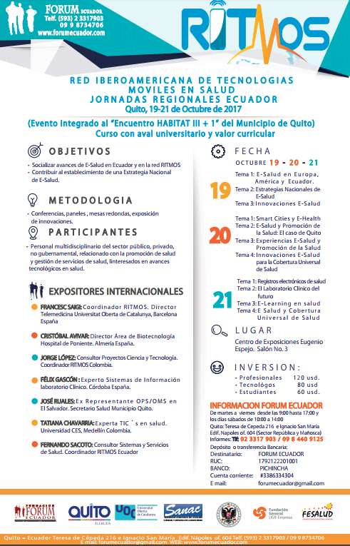 Descripción/Objetivos de la actividad: En cumplimiento de la Misión de la Red Iberoamericana de Tecnologías Móviles en Salud (RITMOS) y la respectiva planificación, se han organizado diversas actividades, entre las que se destacan los Workshops Internacionales de Barcelona y Medellín, realizados en 2015 y 2016, respectivamente. El Taller Regional RITMOS Ecuador se inscribe en la fase de impulso al desarrollo de la mSalud en los países miembros de la Red. El evento de Ecuador es el tercero de los Talleres regionales, después del de Colombia y Chile. Este taller busca ampliar su ámbito de acción hacia otras actividades de I+D+i en Salud, dentro del concepto de Salud Electrónica (eSalud).