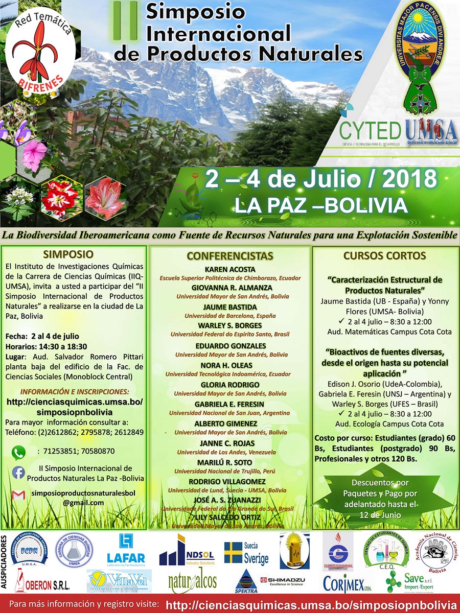 Coincidiendo con los CURSOS a) Caracterización Estructural de Productos Naturales y b) Bioactivos de Fuentes Diversas, desde el origen hasta su potencial aplicacióntendrá lugar en el Instituto de Investigaciones Químicas de la Carrera de Ciencias Químicas (IIQUMSA), el “II Simposio Internacional de Productos Naturales”