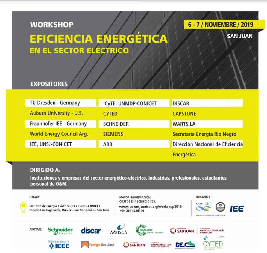 Miembros del grupo de investigación del IEE-UNSJ-CONICET, y de MICROEOLO, fueron parte del comité organizador del Workshop en Eficiencia Energética en el Sector Eléctrico, que tuvo lugar en la ciudad de San Juan los días 6, 7 y 8 de noviembre de 2019.
