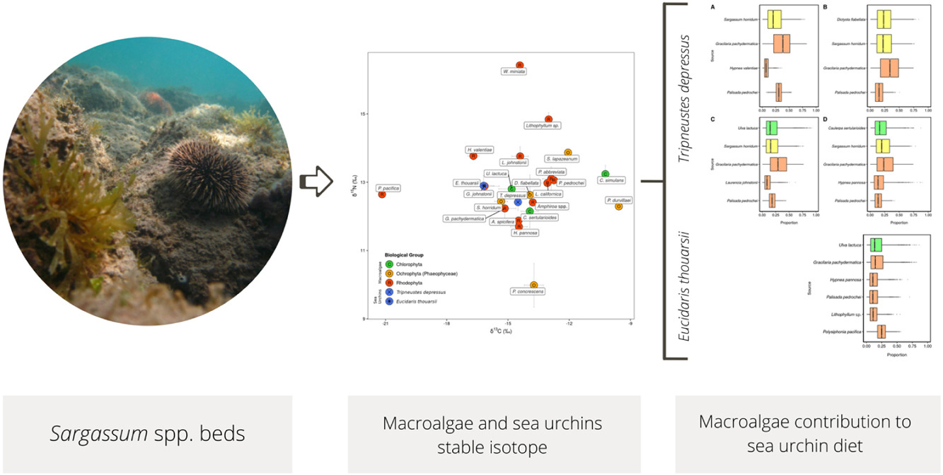 Macroalgae contribution to the diet of two sea urchins in Sargassum Beds: Tripneustes depressus (Camarodonta: Toxopneustidae) and Eucidaris thouarsii (Cidaroide: Cidaridae).