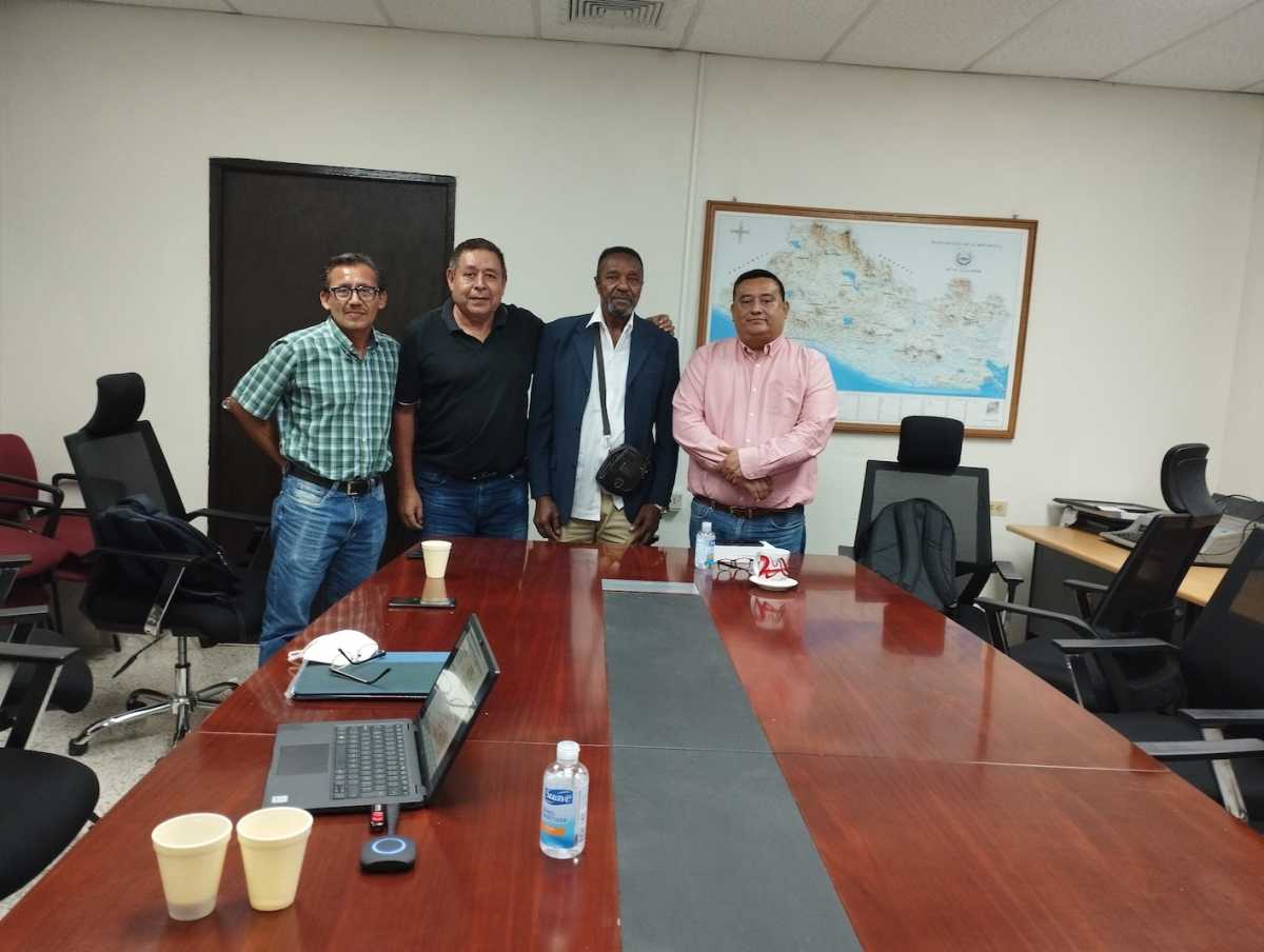 Encuentro del Coordinador de la red 420RT0009 con el Vicerrector Académico de la Universidad de El Salvador, Dr. Raúl Azcunaga. Aparecen de izquierda a derecha: el MSc. Edgar Antonio Marinero Orantes, Director del CEIA-FMP, El Dr. Luis Alberto Orellana, Vicedecano de la FMP, y el Dr. Dámaso R. Ponvert Delisles Batista, Coordinador de RIFOREDEx.