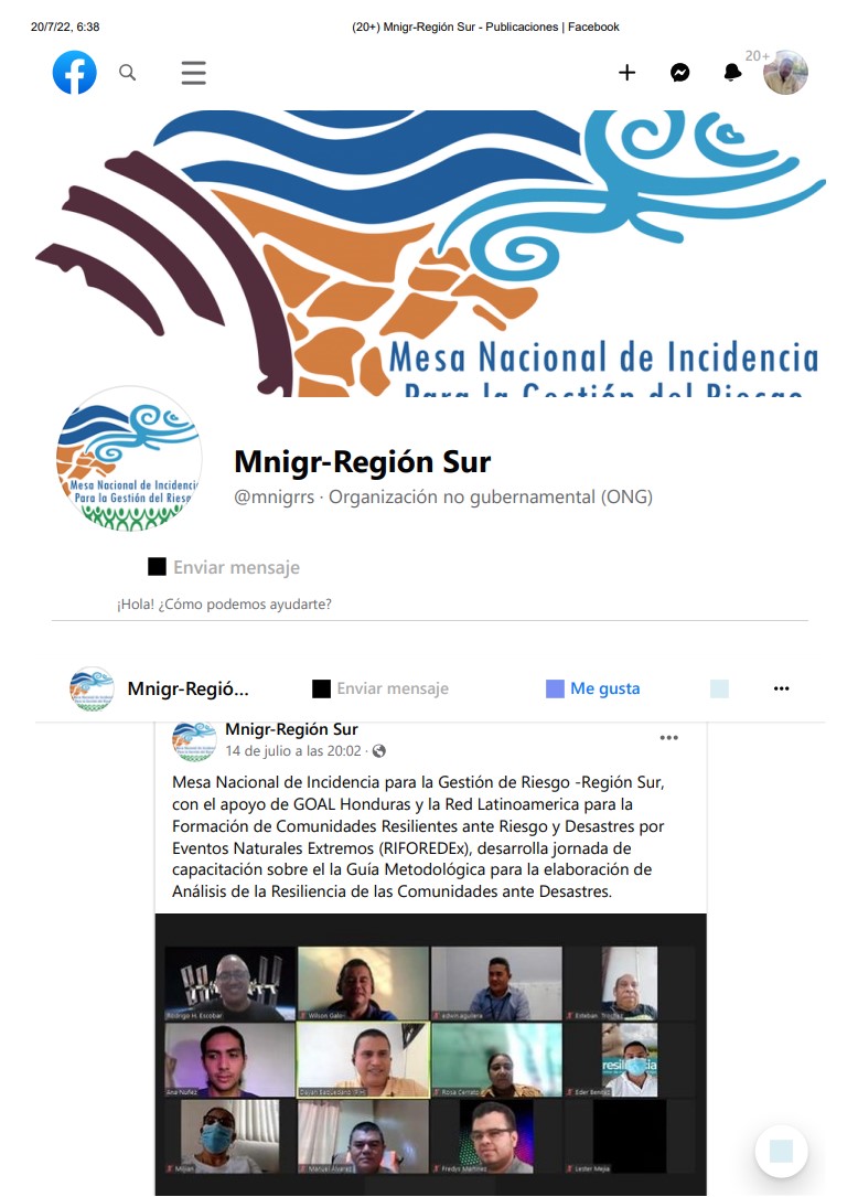 El día 14 de julio del 2022 se efectuó una reunión vía Zoom de miembros de la Mesa Nacional de Incidencia para la Gestión del Riesgo-Riesgo Sur (MNIGR-RS) como parte del Grupo de Honduras de la Red Iberoamericana para la Formación de Comunidades Resilientes ante Riesgos y Desastres por Eventos Naturales Extremos (RIFOREDEx), con el objetivo de analizar la metodología que se utilizará en la medición de las fuentes naturales de resiliencia de la comunidad meta.