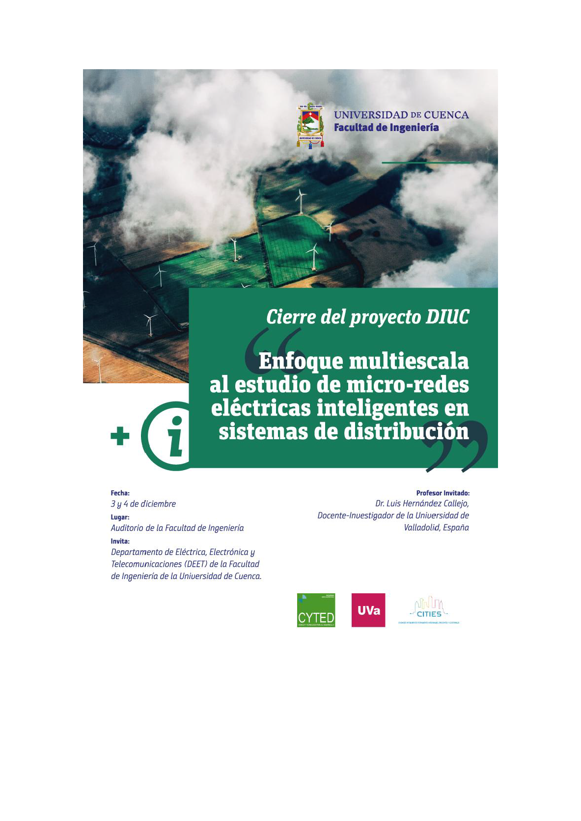 La Universidad de Cuenca (Ecuador), celebra los próximos días 3 y 4 de diciembre de 2018 el cierre de su proyecto DIUC. Entre las actividades programadas se contemplan las conferencias del Coordinador de CITIES sobre "Microrredes Eléctricas: una oportunidad para las fuentes de generación renovables" y "Introducción a los sistemas fotovoltaicos y degradación en los mismos".