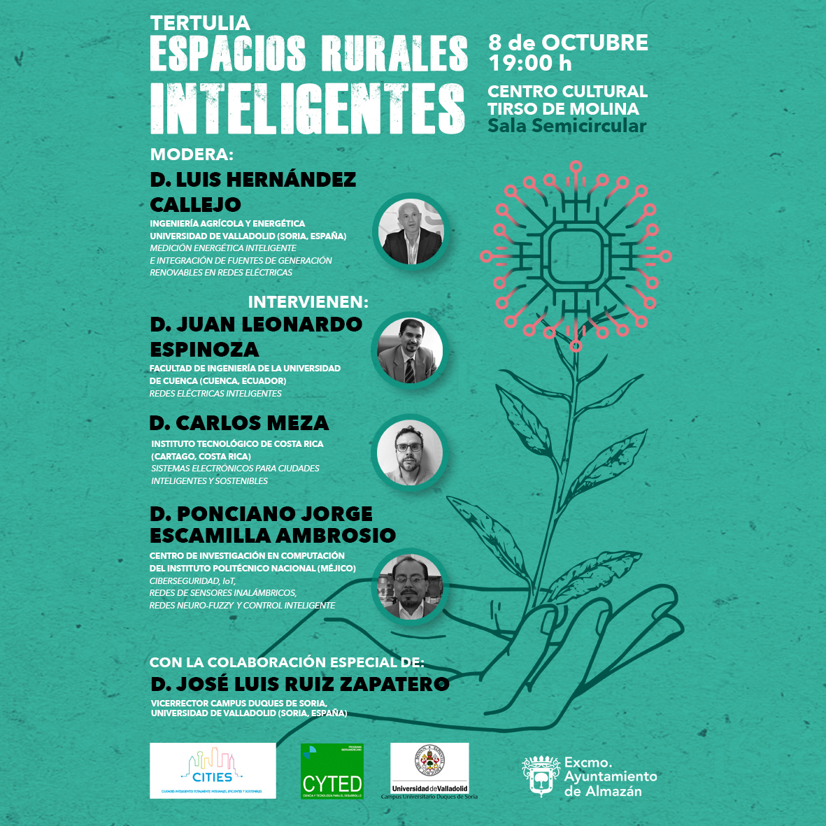 El Ayuntamiento de Almazán (Soria, España) organiza el próximo martes 8 de octubre de 2019 la tertulia Espacios Rurales Inteligentes. este coloquio, inugurado por el Vicerrector del Campus de Soria de la Universidad de Valladolid (UVa), será moderado por el Dr. Luis Hernández Callejo, profesor del Grado de Ingeniería Agrícola y Energética de la UVa y Coordinador de la Red Temática CITIES.