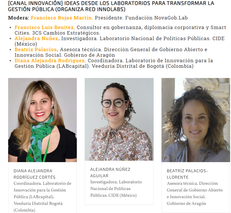 La sesión de la Red Innolabs, moderada por Francisco Rojas, coordinador de la Red, se desarrolló el 29 de octubre de 2020 con 120 asistentes. Contó con la participación de Francisco Luis Benitez. Consultor en gobernanza, diplomacia corporativa y Smart Cities. 3CS Cambios Estratégicos; Alejandra Nuñez. Investigadora. Laboratorio Nacional de Políticas Públicas. CIDE (México); Beatriz Palacios. Asesora técnica. Dirección General de Gobierno Abierto e Innovación Social. Gobierno de Aragón y Diana Alejandra Rodríguez. Coordinadora. Laboratorio de Innovación para la Gestión Pública (LABcapital). Veeduría Distrital de Bogotá (Colombia)