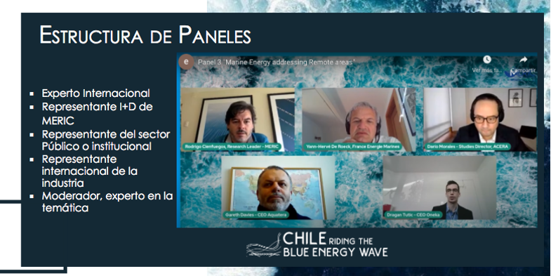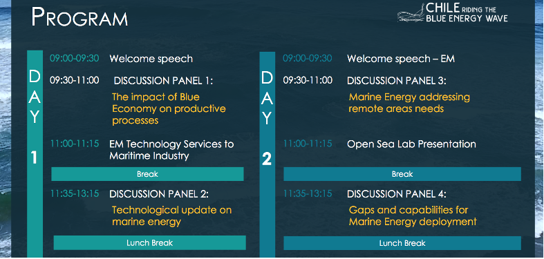 Su objetivo fue generar un acercamiento y comprensión de cómo las energías marinas pueden ser soluciones aplicadas para la industria, trayendo ejemplos de otros países. Por esto, se trabajó frente a 3 temáticas principales: zonas remotas, la economía azul y las tecnologías actuales de energía marina y soluciones a mercados específicos. Al mismo tiempo se contó con un panel de discusión en torno a las conclusiones y sobre cómo impulsar la energía marina en Chile, considerando las oportunidades que tiene el país.