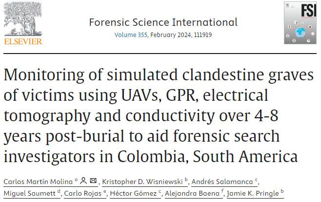 Monitoring of simulated clandestine graves of victims using UAVs, GPR, electrical tomography and conductivity over 4-8 years post-burial to aid forensic search investigators in Colombia, South America