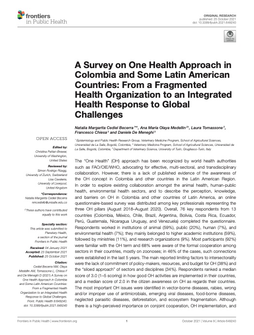 A Survey on One Health Approach in Colombia and Some Latin American Countries: From a Fragmented Health Organization to an Integrated Health Response to Global Challenges
