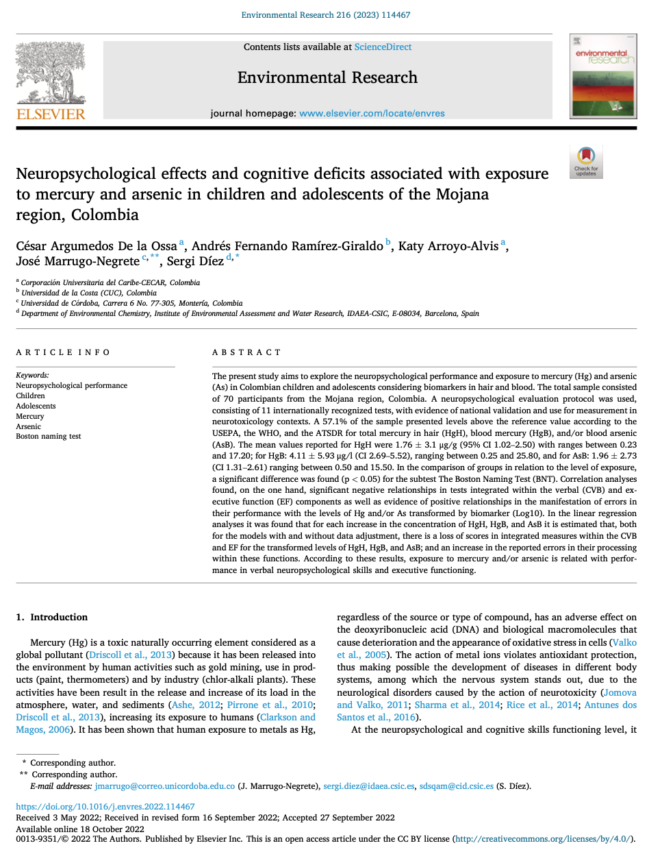 Neuropsychological effects and cognitive deficits associated with exposure to mercury and arsenic in children and adolescents of the Mojana region, Colombia
