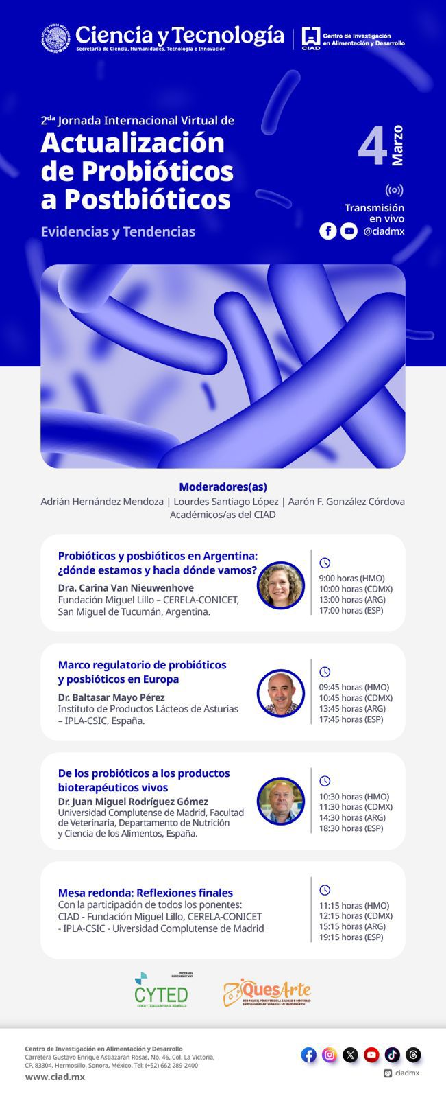El Centro de Investigación en Alimentación y Desarrollo (CIAD) y la Red para el Fomento de la Calidad e Inocuidad en Queserías Artesanales en Iberoamérica (QuesArte) del Programa Iberoamericano de Ciencia y Tecnología para el Desarrollo (Cyted) invitan a participar en la 2da. Jornada Internacional Virtual de Actualización de Probióticos a Posbióticos: evidencias y tendencias.