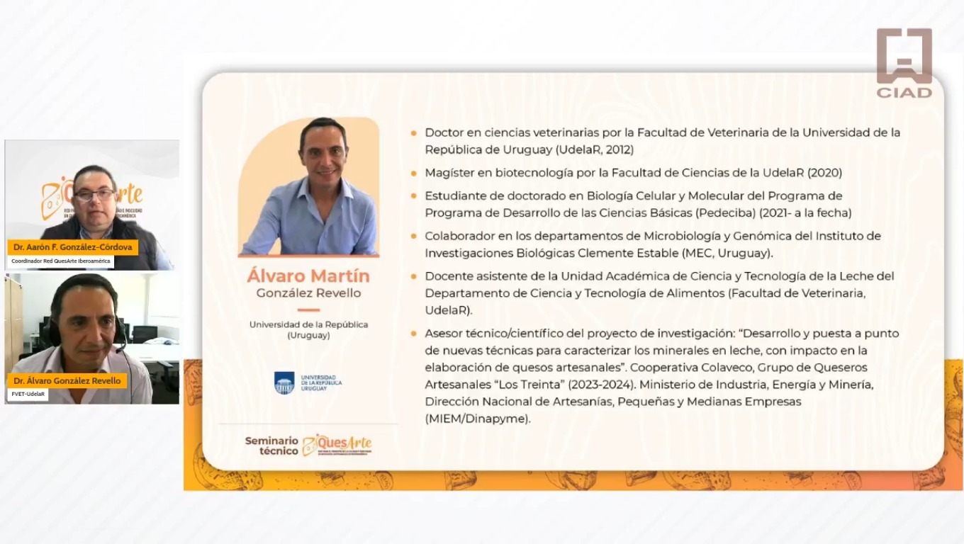 El pasado 24 de mayo, Silvana presentó desde el CIAD el seminario técnico intitulado: “Caracterización de los quesos artesanales en Uruguay: situación actual¨. Este seminario se transmitió de manera virtual a través de las redes sociales del Centro de Investigación en Alimentación y Desarrollo (Facebook/YouTube) y contó con la participación de estudiantes y académicos, quienes pudieron conocer los aspectos más sobresalientes de la quesería artesanal de aquel país, así como algunos de los trabajos realizados desde la Facultad de Medicina Veterinaria de la UdelaR en favor de la quesería artesanal uruguaya.
